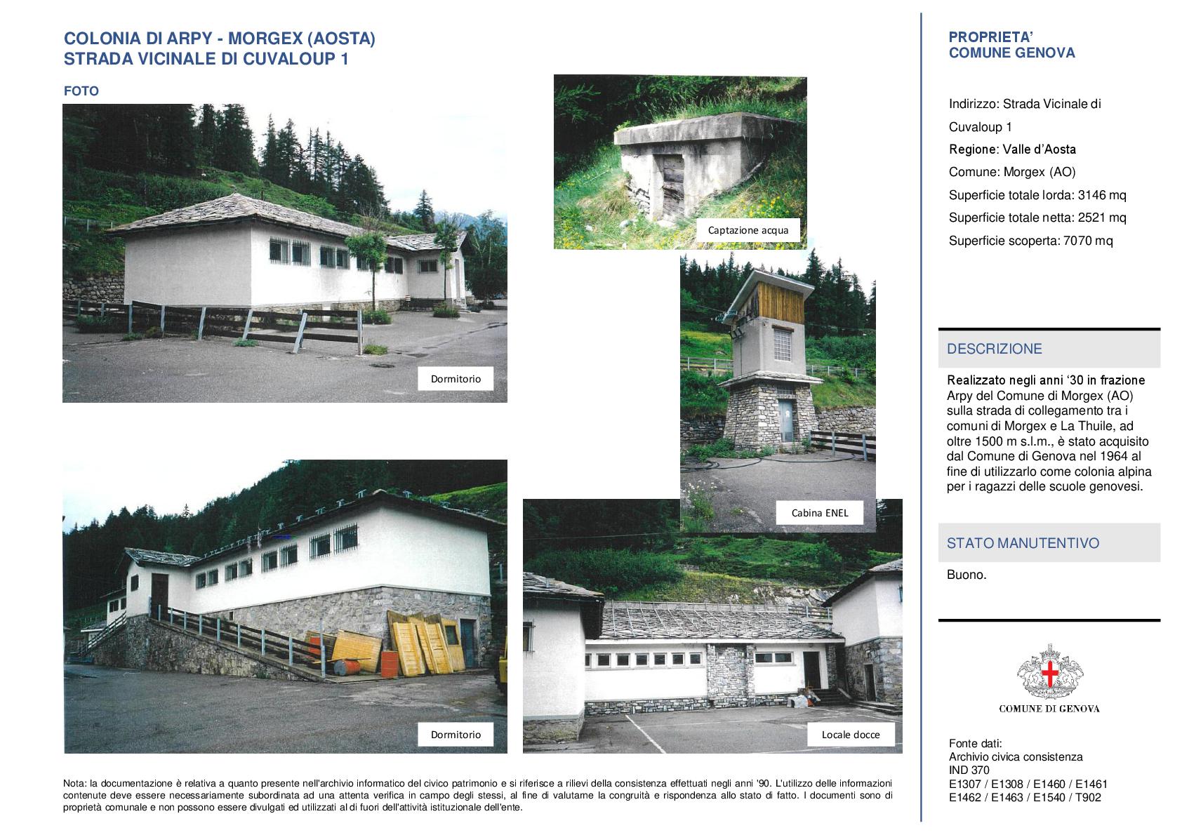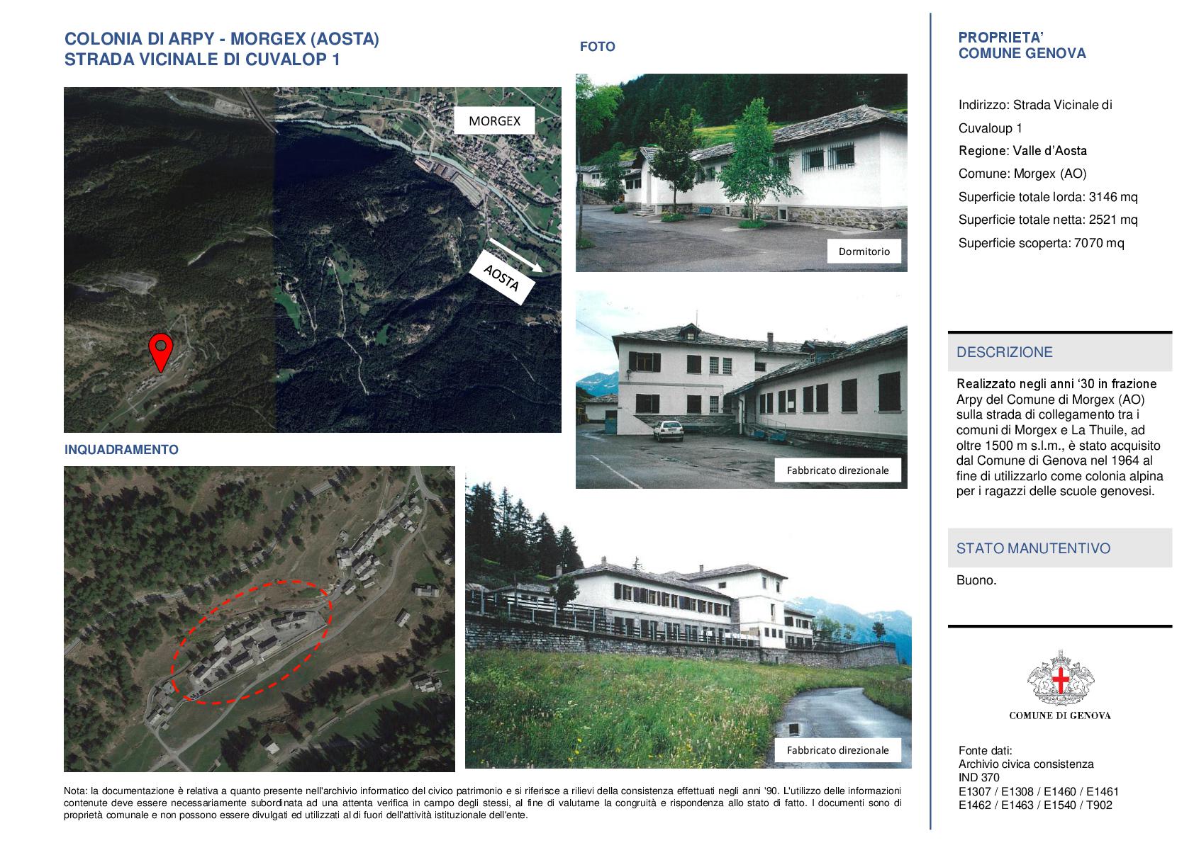 Arpy's Holiday Camp is located in the municipality of Morgex, a hamlet of Arpy (1,700 meters above sea level), along the road connecting Morgex and La Thuile, a well-known ski resort in the Aosta Valley. The property, built in the 1930s and acquired by the municipality of Genoa in 1964 as a mountain holiday camp for school children, is suitable for a redevelopment and refunctionalisation intervention given its location of great tourist appeal.