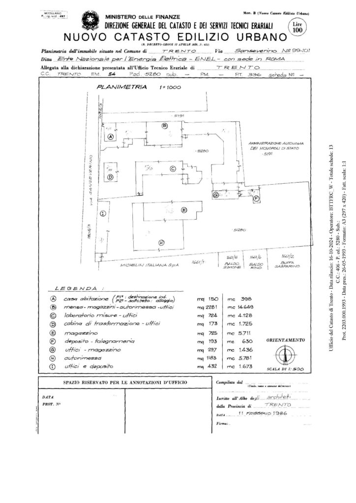 The complex, once used as Enel’s operational headquarters, is made up of several buildings of different ages. The lot, defined by a perimeter of buildings, some of which border the area, is located in Trento, south of the former Michelin plant. The area is bordered by the Palazzo delle Albere/MUSE/private lot to the north, a supermarket and the railway power plant to the east, the public parking lot and Via Monte Baldo to the south, and the Adige riverside street to the west.