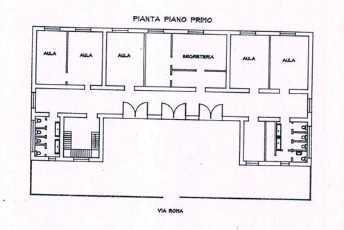 L’edificio sviluppa un impianto planimetrico a forma di C con i lati corti che si affacciano sul prospetto principale di Via Roma. Il fabbricato, articolato su tre livelli fuori terra, è servito da due corpi scala che consentono l’accesso ai piani superiori. Attraverso l’ingresso principale, si accede direttamente agli ambienti del primo piano costituiti da un ampio corridoio, quattro gradi aule, servizi igienici e vani scala per mezzo dei quali si accede al piano secondo, con distribuzione delle stanze identica al primo piano, ed al sottostante piano terra. A quest’ultimo livello, si è evidenziata una difformità con le planimetrie depositate presso gli uffici comunali (con la chiusura di parte del corridoio, si è creata una zona accessibile solo dal cortile esterno). Si evidenzia inoltre che, tra la sede stradale ed il fabbricato, esiste uno spazio coperto dal piazzale di ingresso soprastante utilizzabile come rimessa e deposito. Internamente l’edificio è provvisto di impianti la cui funzionalità non è stata però verificata per le generali condizioni di pericolosità dell’immobile in disuso da anni.
